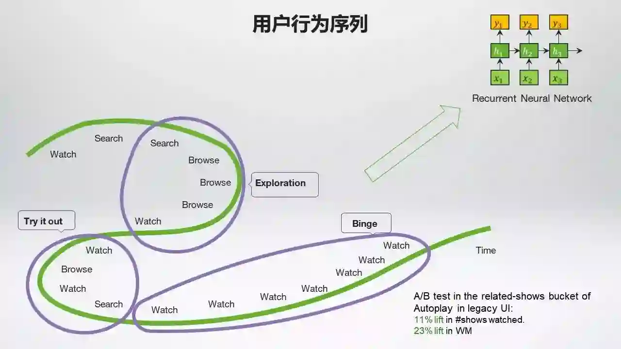 我们把用户在网站上的一个行为序列,认为是由这种RNN模型所产生的。我们可以用反向传播的方法去训练一个RNN模型,来预测用户在网络上的下一个行为。采用了RNN的时间序列之后,我们在线上的测试观察到了非常高的提升。我们仿真测试的方法就是当用户看完剧A/B/C之后,我们假装不知道这个用户接下来看了哪一个,然后基于时间序列的建模,来算出一个最可能看的剧,它可能是当前这一剧的下一集,或者是跳到另外一个剧D或者是另外一个剧E。根据RNN模型,我们找到最有可能的下一个剧,然后和用户实际看的下一个剧之间做比对,这是离线的一种评估方案。
