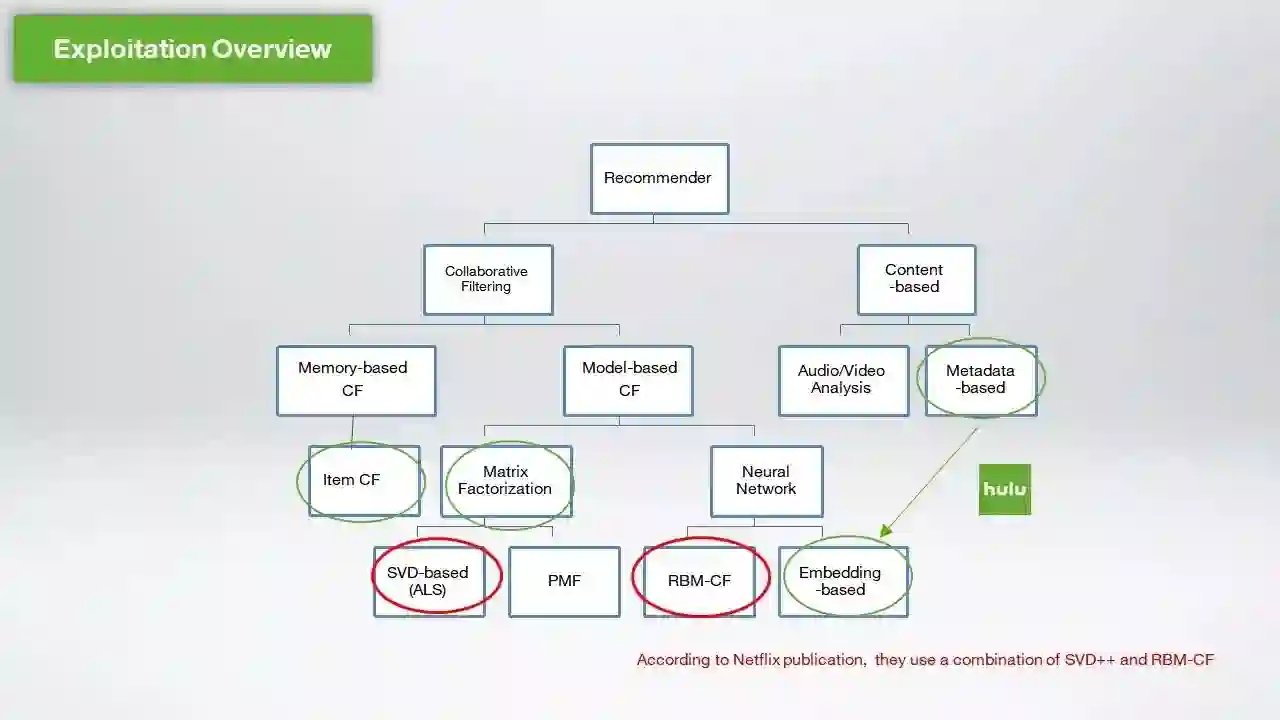 Hulu经历了三代相关性算法的演进,第一代是item-based CF,第二代是基于矩阵分解,现在我们正在开发的第三代是基于Embedding-based Neural Network。从Netflix公开的文件来看,它主要使用的是SVD和RBM的方法。