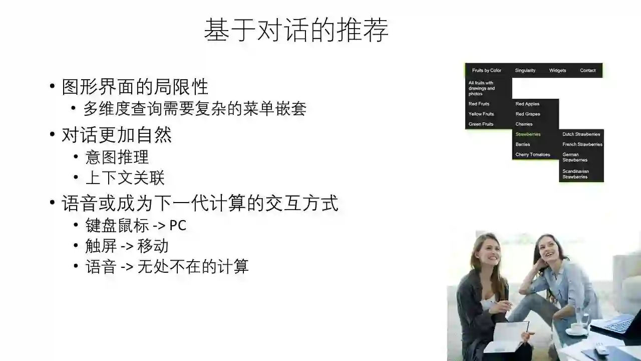我们提出基于语音对话的推荐,使得整个过程更加自然。我们可以允许用户用一个简单的自然语言来表述一个非常复杂的查询条件。然后当用户对当前的推荐不满的时候,他也可以用自然语言来告诉我们,为什么他不喜欢这个剧,以及他想要换另外一个什么样的剧。我们认为语音交互会成为下一代计算的一个催化剂。大家知道PC时代,鼠标和键盘是最流行的交互方式,到了移动时代,触屏变成了手机上的最流行的交互方式。随着物联网的发展,我们认为语音会成为下一代的交互方式。