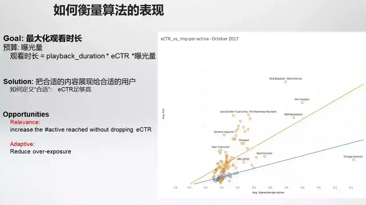 当然从这个曲线里面,我们也看到有一些eCTR不是那么高的内容,比如说College football,在最右下角的地方,它也获得了比较大的曝光,这就属于过度曝光。所以这也提出了我们优化的一些可能的空间:可以把分给点击不是那么高的物品的曝光量,匀一些给其它的更高点击、但是曝光不足的内容。