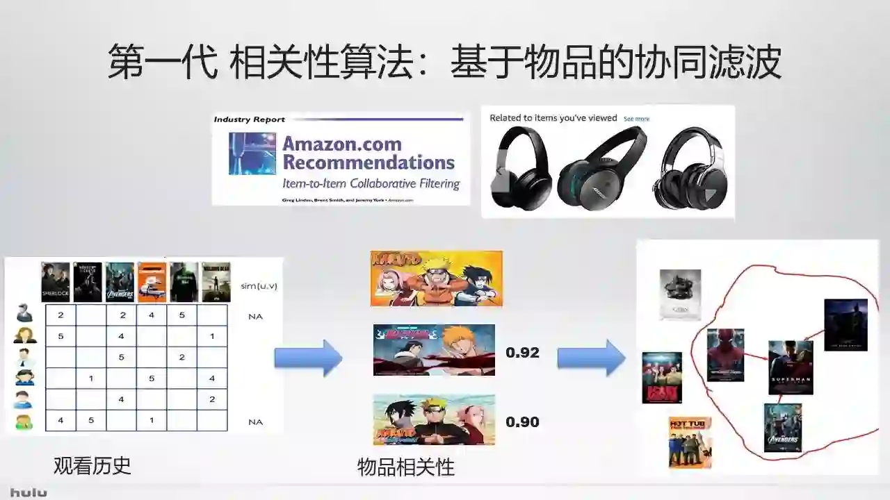 我们先讲比较古老的一代相关性算法:基于物品的协同滤波。最早是20年前亚马逊在它的电商网站上使用的。它会构建一个用户和物品的相对评分或者影视的相关性矩阵。就是我在左下角画的这个矩阵,它每一行是一个用户,每一列是一个物品,里面的数值可以是用户购买这个物品的次数,或者点击这个物品的次数。就是用一些用户的隐式行为,把它转换成为用户和这个物品之间的某种评分。这个分数越高的话,它就和这个物品的相关性越高。