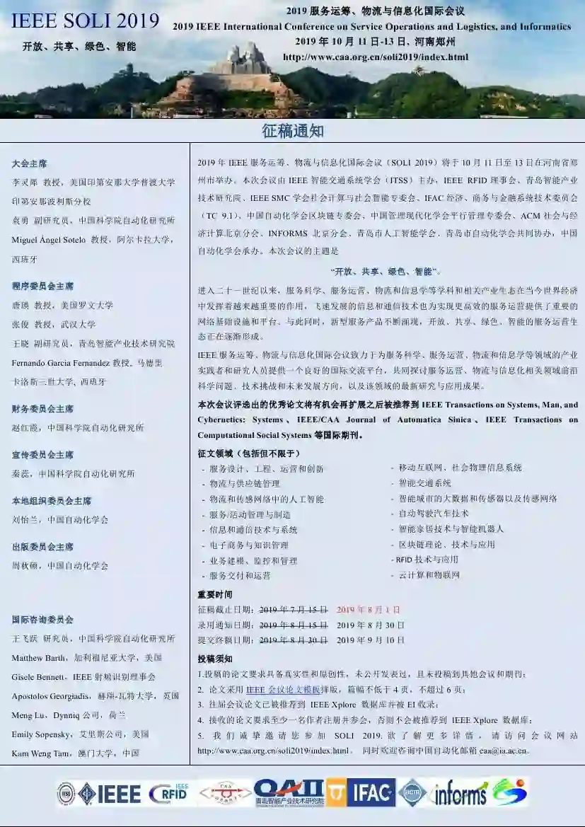 【导读】2019年IEEE服务运筹、物流与信息化国际会议(SOLI 2019)将于2019年10月11日至13日在河南省郑州市举办。应广大作者要求,现征稿截止时间延至2019年8月1日,请各位投稿人周知,欢迎踊跃投稿。