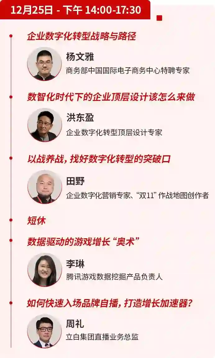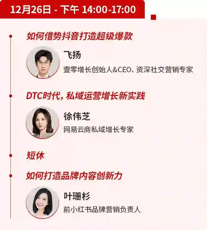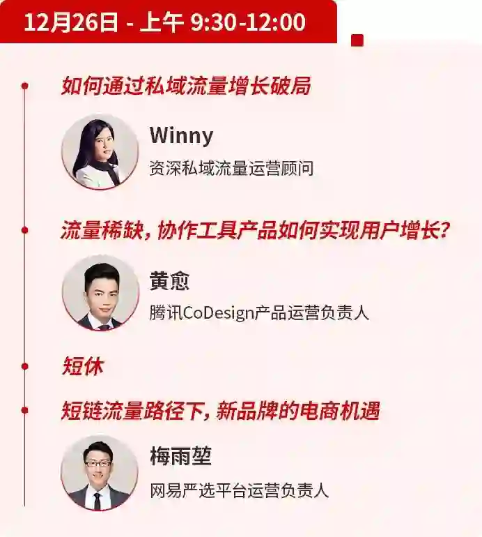 因此这一场,我们邀请了来自腾讯、网易等互联网头部企业的资深运营增长操盘手,还有在电商、直播、新零售、新消费、游戏、社交、私域、数字化等等领域深入多年的行业专家。