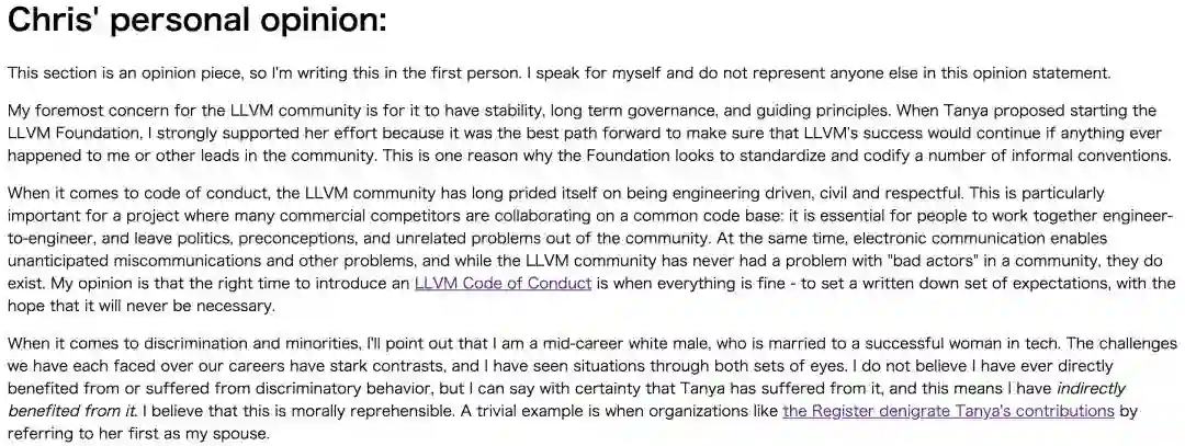 之后,Chris 认为之前发的推文措辞不佳,再次发布一篇长文以表明自己的观点。在文中,他详细说明了该事件直接涉及到的几个人以及 LLVM 基金会、Outreachy 组织中间的关系:与 Outreachy 和 Google Summer of Code 等组织的合作是 LLVM 基金会的发展计划之一,旨在提高技术的参与度。