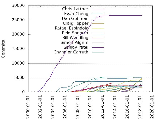 Rafael 自 2006 年以来已为 LLVM 贡献了超过 4,300 个 commits ,添加了 157,679 行代码,是 LLVM 的排名第五的贡献者。
