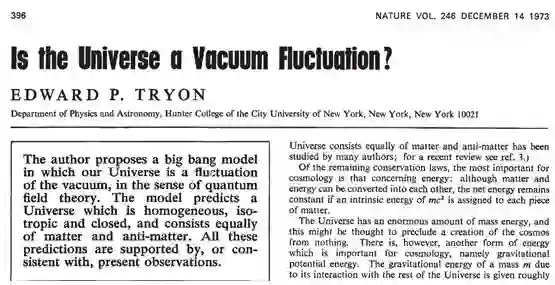 1973年12月,大名鼎鼎的英国《自然》(Nature)杂志发表了一篇两页纸的学术论文,题目是“宇宙是真空涨落的产物吗?”(Is the Universe a vacuum fluctuation?),作者是名不见经传的美国纽约市立大学亨特学院的年轻教师爱德华·特莱恩(Edward Tryon)。据说特莱恩在写出这篇立意大胆的理论文章之后,先将它投给了美国物理学会主办的《物理评论快报》(Physical Review Letters),但却很快就遭到了拒稿。时年33岁的特莱恩并没有气馁,转而改投名气更大的《自然》期刊,希望自己的论文能以“读者来信”(a letter to the editor)的形式发表。结果出乎他本人的预料:《自然》编辑部不仅很快接受了这篇论文,而且还以“专题文章”(feature article)的形式正式刊出。