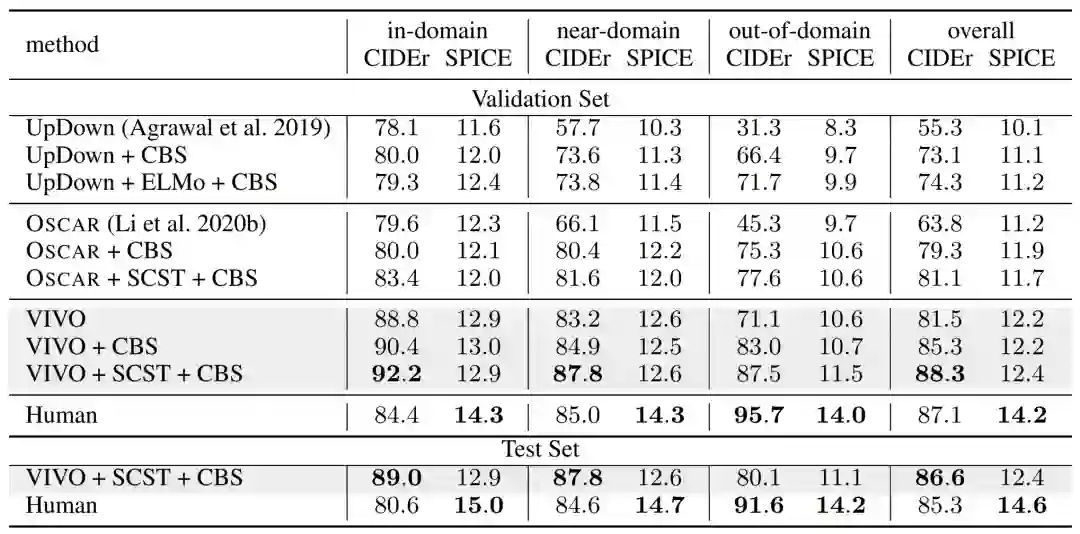 研究员们将 VIVO 与 nocaps 挑战中一些领先的方法,如 UpDown 、 OSCAR 等做了对比(这些方法使用的训练数据也是 COCO)。另外,遵循之前的方法,添加了使用 SCST 和 Constrained Beam Search (CBS)之后的结果。在 nocaps 的校验集(validation)和测试集(test)上的结果显示在表1中。可以看到,相比于之前的方法,VIVO 的结果表现有了显著的提高。仅仅使用 VIVO 预训练就取得了远超过 UpDown+ELMo+CBS 和 OSCAR 的结果。最终,VIVO 方法的结果达到了新的 SOTA,并且首次在 nocaps 挑战中超过了人类表现的 CIDEr 得分。