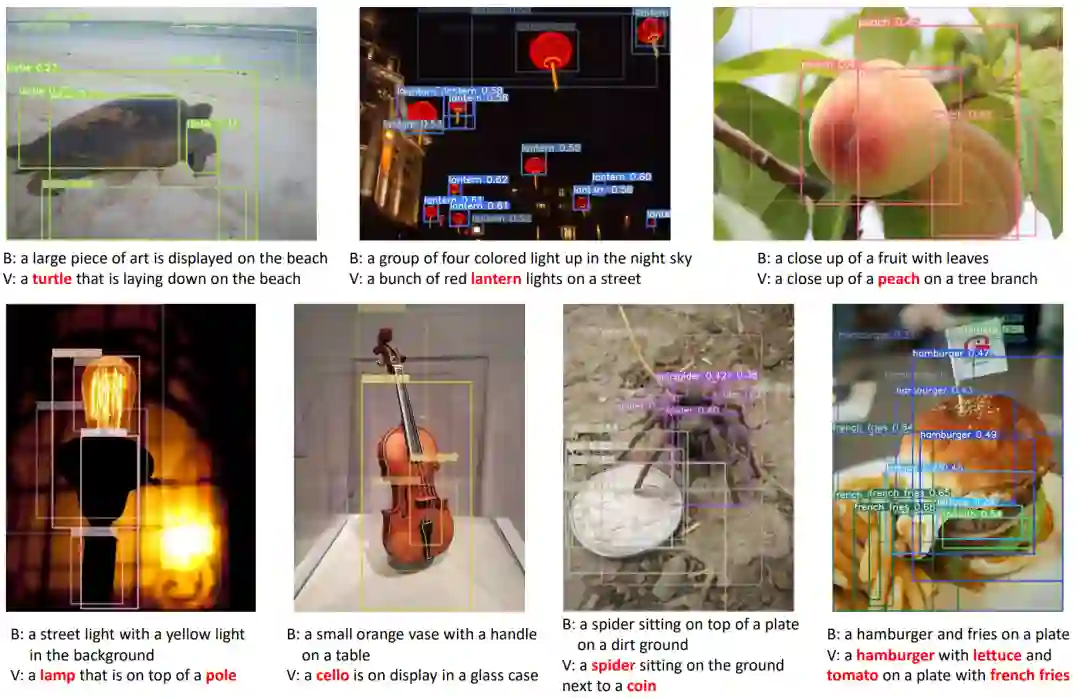 图3:模型对 nocaps 图片的描述结果。B:没有做 VIVO 预训练的模型。V:有 VIVO 预训练的模型。红色文字显示了描述中出现的新物体。图中还显示了各个图片区域和描述中出现的新物体对应特征向量之间的相似度,相似度越高的组合颜色亮度越高。