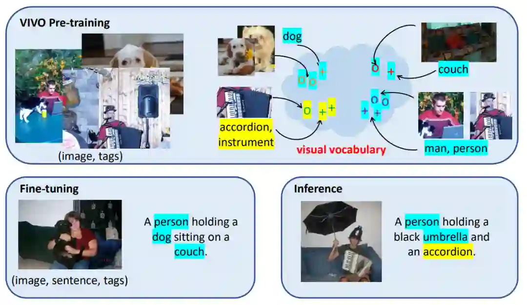 图1:VIVO 预训练使用大量的图片标签标注来建立视觉词表,其中语义相近的词汇与对应的图像区域特征会被映射到距离相近的向量上。微调使用只涵盖一部分物体(蓝色背景)的少量文本描述标注进行训练。在测试推理时,模型能够推广生成新物体(黄色背景)的语言描述,得益于预训练时见过的丰富物体类型。
