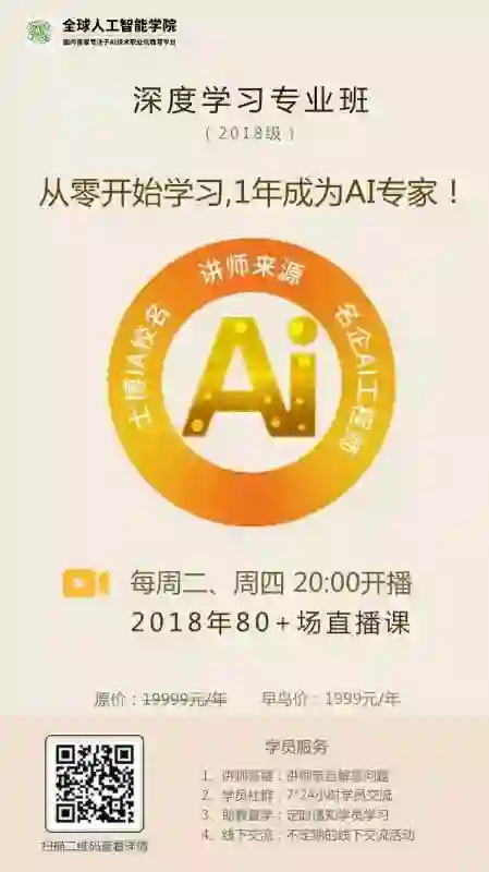 《全球人工智能学院》邀请中科院、清华、斯坦福、卡内基梅隆、伊利诺伊香槟分校等十几所全球顶级名校的AI科学家共同打造《深度学习专业班》——从零开始学习(从最基础的数学符号,专业名字的中英文对照表、专业词汇的概念与含义,数学公式、算法模型推导、神经网络,深度学习训练,到最新的ai技术paper解读),每周2次直播,全年80多次课程,全面系统地进行讲解;希望每个学员通过这1年的学习能从一个小白变成一个真正的AI专家。