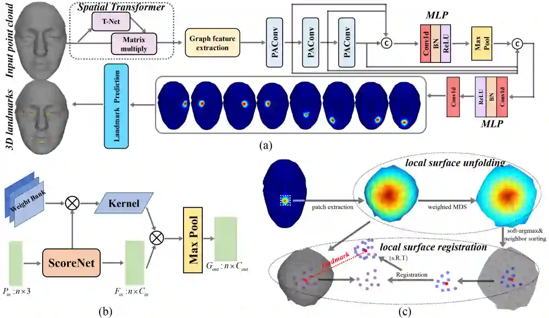 本文提出了一种新的三维人脸关键点检测的方法,该方法利用精心设计的图卷积网络,直接从三维点云中定位关键点的坐标。热力图是三维人脸上每个地标距离的高斯函数,图卷积网络在构建的三维热力图的帮助下可以自适应学习几何特征,用于三维人脸关键点检测。在此基础上,我们进一步探索了局部曲面展开与曲面配准模块,从3D热力图中直接回归3D坐标。