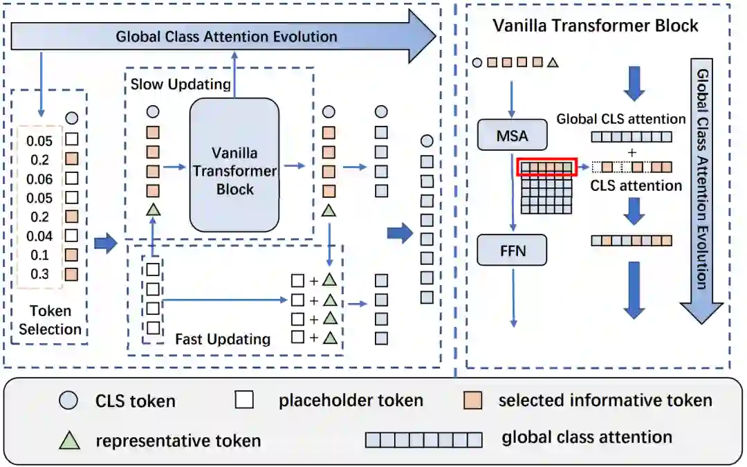 为了解决这些问题,我们提出了快速-慢速双流标识更新策略,在保持了完整空间结构的同时给高信息量标识和低信息量标识分配不同的计算通道,从而在不改变网络结构的情况下,以极低的精度损失大幅提升直筒状和金字塔压缩型的Transformer模型推理性能。不同于以往方法需要依靠外部的可学习网络来对每一层的标识进行选择,我们进一步提出了基于Transformer原生的全局类注意力的标识选择策略来增强层间的通信联系,从而使得我们的方法可以在稳定标识选择的同时去除了外部可学习参数带来的直接训练难的问题。