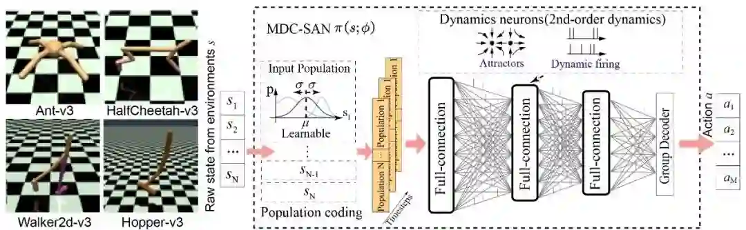 受生物大脑中细胞集群(Cell Assembly)高效计算的启发,我们提出了一种多尺度动态编码方法来提升脉冲人工网络(MDC-SAN)模型,并应用于强化学习以实现高效决策。多尺度表现为网络尺度的群体编码和神经元尺度的动态神经元编码(包含二阶神经元动力学),可以帮助SNN形成更加强大的时空状态空间表示。大量实验结果表明,我们的 MDC-SAN 在 OpenAI Gym的四个连续控制任务上取得了相比无编码SNN和相同参数下DNN更好的性能。