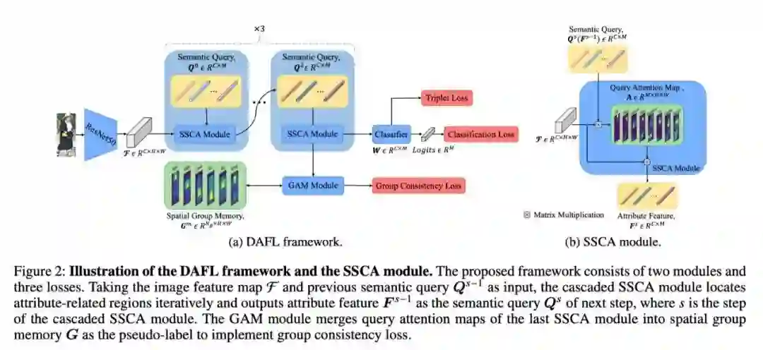 为了解决这些局限性,我们提出了一个新颖的分离属性特征学习(DAFL)框架,为每个属性学习一个分离的特征,该框架利用了属性的语义和空间特征。该框架主要由可学习的语义查询、级联式语义空间交叉注意(SSCA)模块和群体注意合并(GAM)模块组成。具体来说,基于可学习语义查询,级联式SSCA模块迭代地增强了属性相关区域的空间定位,并将区域特征聚合为多个分解的属性特征,用于分类和更新可学习语义查询。GAM模块根据空间分布将属性分成小组,并利用可靠的小组注意力来监督查询注意力图。在PETA、RAPv1、PA100k和RAPv2上的实验表明,所提出的方法与最先进的方法相比表现良好。