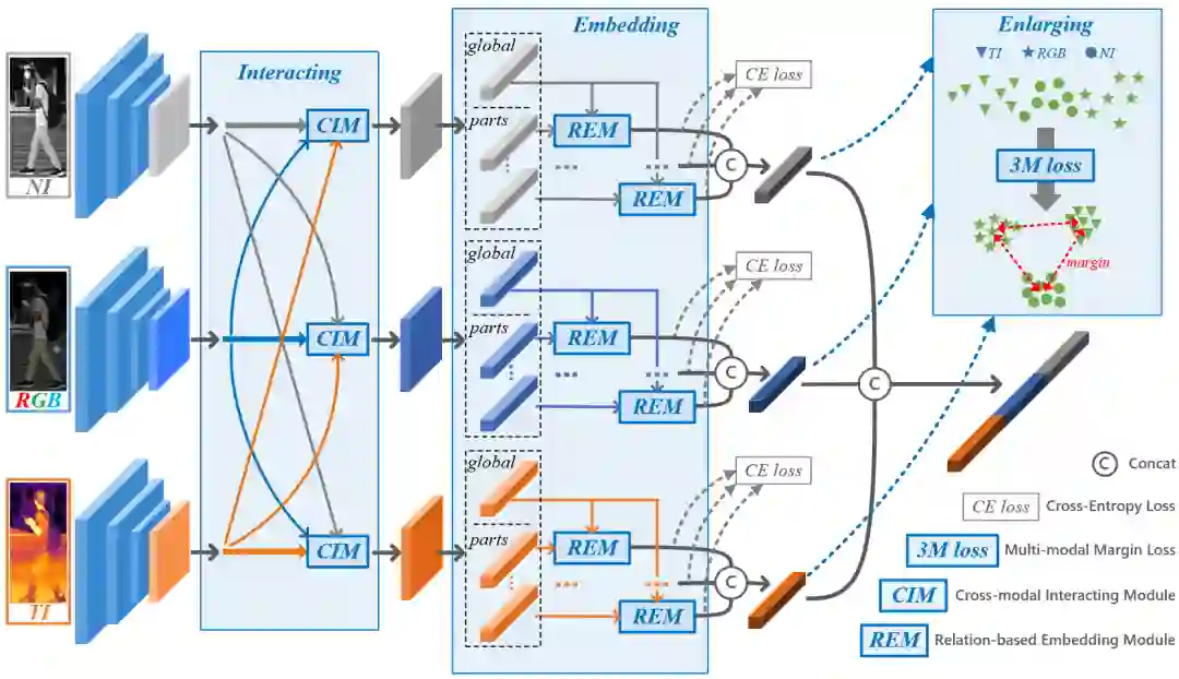 首先,提出了一种新颖的跨模态交互模块,用于在特征提取阶段在不同模态之间交换有用的信息。其次,提出了一种基于关系的嵌入模块,通过将全局特征嵌入到细粒度的局部信息中来增强模态特异特征的丰富度。最后,提出了一种新颖的多模态边界损失,通过扩大类内不同模态的差异来迫使网络学习每种模态的模态特定信息。在真实的和构建的行人重识别数据集上优越性验证了所提出方法的有效性。