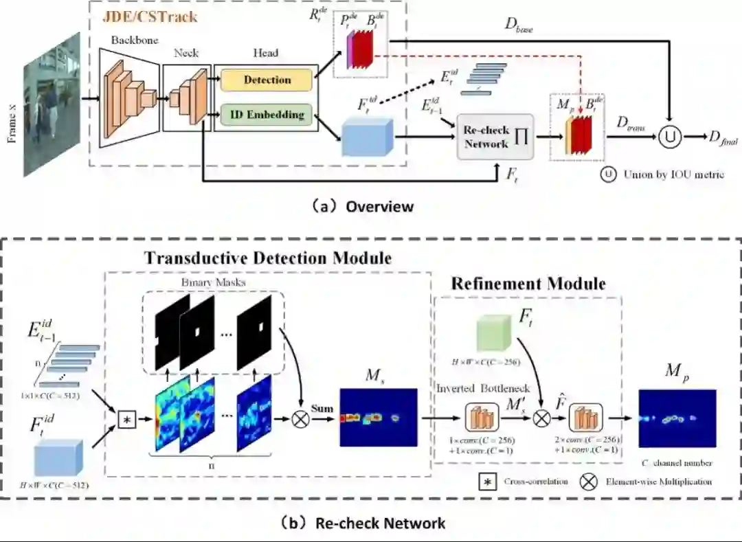 近年来,将检测和ReID统一到一个网络之中来完成多目标跟踪的方法取得了巨大的突破,且引起了研究人员的广泛关注。然而当前的一体化跟踪器仅依赖于单帧图片进行目标检测,在遇到一些现实场景的干扰,如运动模糊、目标相互遮挡时,往往容易失效。一旦检测方法因为特征的不可靠而将当前帧的目标错判成背景时,难免会破坏目标所对应的轨迹的连贯性。