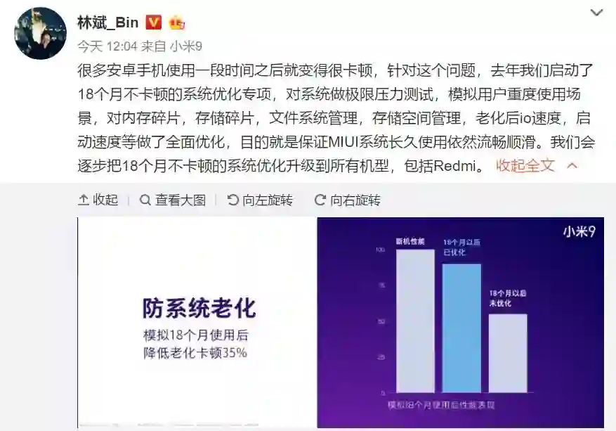 更给力的是,这不是小米9专属福利,林斌强调,“会逐步把18个月不卡顿的系统优化升级到所有机型,包括Redmi。