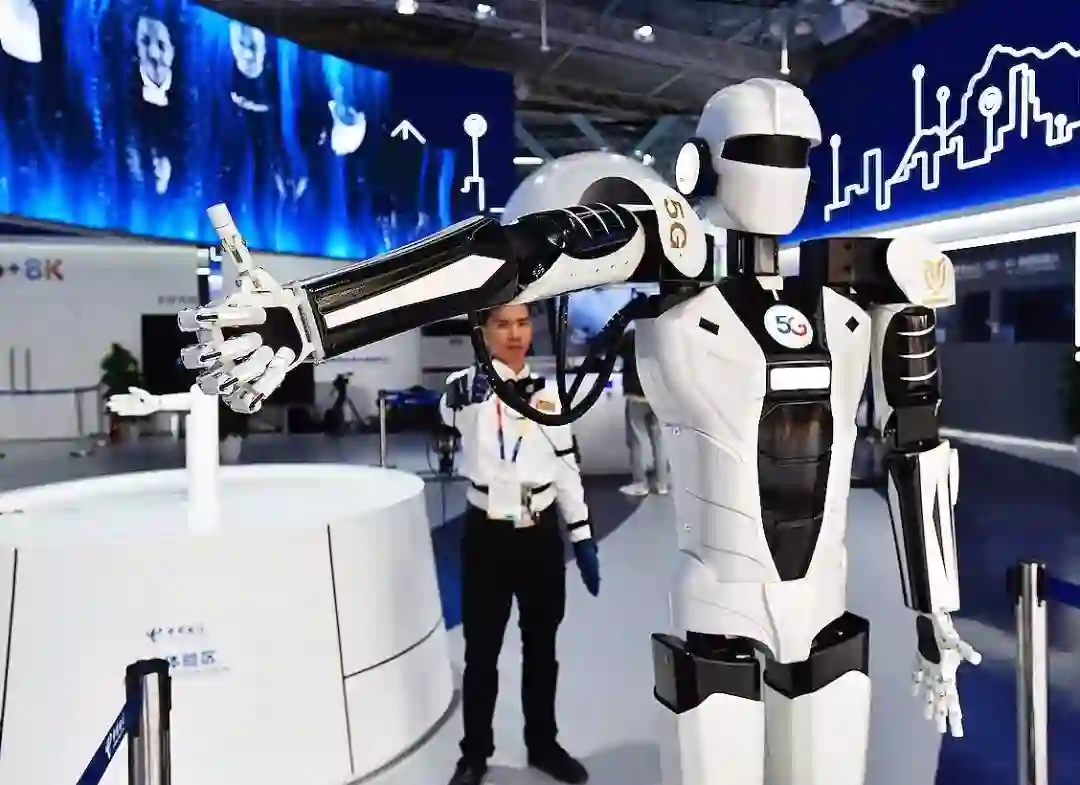 看看这是什么?在中国电信5G展馆内,一位工作人员竖起了一个大拇指,而站在其前面的机器人几乎同步的跟他做了一样的动作。在5G网络的覆盖下,工作人员通过感应服装,实现了和机器人的动作同步。这类机器人在高危场景下有广阔的应用场景。☟