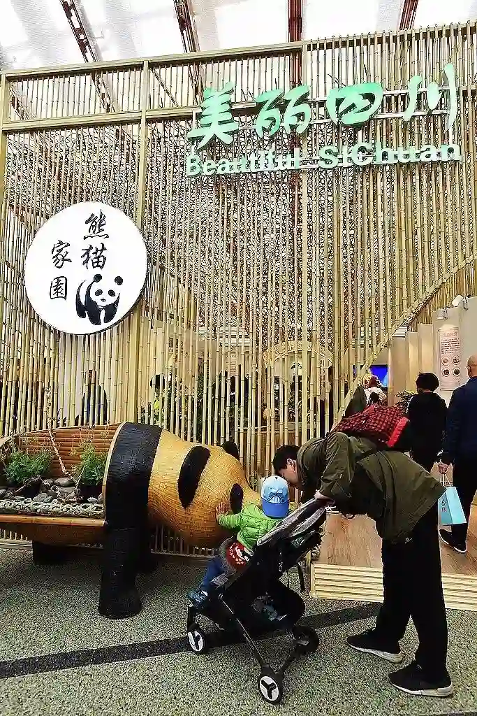 四川馆外一个小朋友正与竹子编织的熊猫玩偶互动。☟