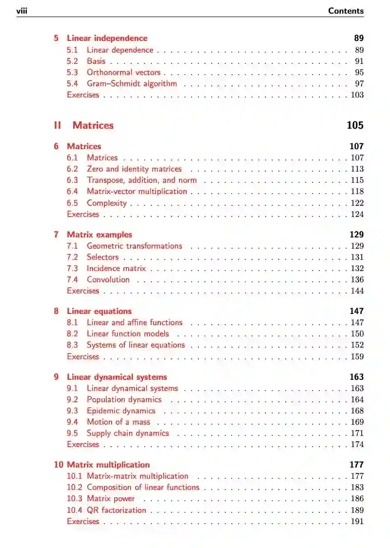 按照设计,本书的进度会逐渐加快,也就是说第一部分和第二部分有许多细节和简单的例子,第三部分有更多高级的例子和应用。对于只有很少线性代数基础或根本没有的读者而言,课程可以侧重于第一部分和第二部分,并且仅简单了解一些更高级的应用。而熟悉背景知识的读者可以快速过一遍前面两部分,并将重点放在最后的应用部分上。