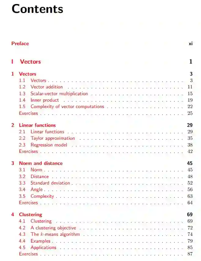 这本书主要分为三部分。第一部分介绍了向量及各种向量运算和函数,例如加法、向量内积、距离和角度等。本书还展示了如何使用向量表示文档中的词数、时间序列、目标属性、产品规格、音频数据和图像等。第二部分如同前一部分重点关注矩阵的概念与应用,包括矩阵的求逆和解线性方程等。第三部分介绍了最小二乘法,它不仅展示了如何简单而自然地近似求解一个超定方程组,同时还有一些可应用到很多方法的最小二乘扩展知识。
