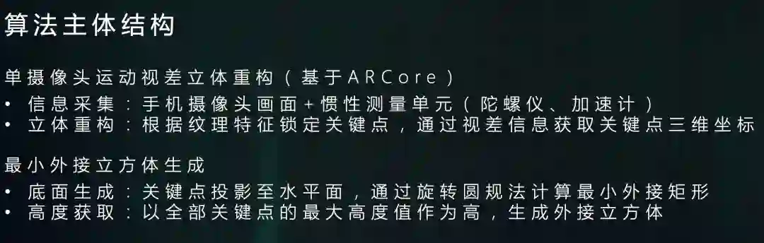 既然要面向应用,那么算法就应该简洁一些。VMeasure 的思路非常清晰,首先基于 ARCore 完成立体重构,然后再计算最小外接立方体。