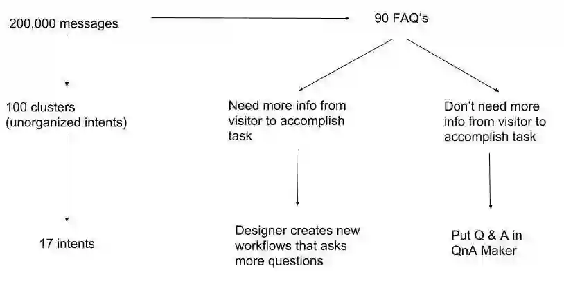 要准确地将意图分配给对应的信息集群需要人工操作。当集群数量很多时,对团队而言就是个很繁琐的任务。而且,将90个常见问题整理成能够反映用户意图的工作流程,需要多元化背景团队的密切合作。