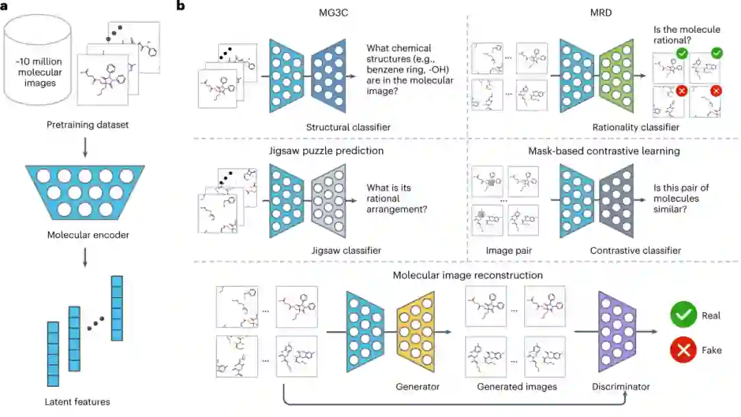 (2)考虑分子图像中的化学知识和结构信息,利用五个预训练策略(MG3C、MRD、JPP、MCL、MIR)来优化分子编码器的潜在表示 (b) 。具体来说为: