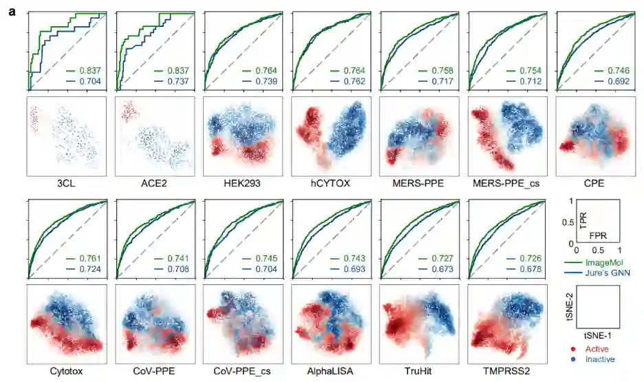 ImageMol 对现如今关注的热点病毒 SARS-CoV-2 进行了预测实验,在 13 个 SARS-CoV-2 生物测定数据集中,ImageMol 实现了 72.6% 至 83.7% 的高 AUC 值。图 a 揭示了通过 ImageMol 鉴定的潜在特征,它在 13 个靶点(target)或终点(endpoints)活性和无活性的抗 SARS-CoV-2 上很好的聚集,且 AUC 值均比另一种模型 Jure’s GNN 要高 12% 以上 ,体现出该模型的高精度和很强的泛化性。