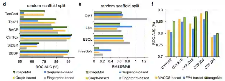 本文进一步将 ImageMol 的性能与三种最先进的分子表示模型进行了比较,如图 d、e 所示。ImageMol 与使用随机骨架划分的基于指纹的模型(如 AttentiveFP)、基于序列的模型(如 TF_Robust)和基于图的模型(如 N-GRAM、GROVER 和 MPG)相比具有更好的性能。此外,与传统的基于 MACCS 的方法和基于 FP4 的方法相比,ImageMol 在 CYP1A2,CYP2C9,CYP2C19,CYP2D6 和 CYP3A4 上实现了更高的 AUC 值(图 f)。