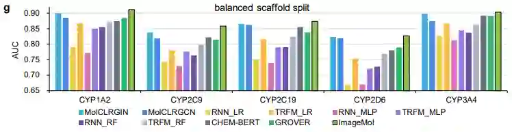 ImageMol 与基于序列的模型(包括 RNN_LR、TRFM_LR、RNN_MLP、TRFM_MLP、RNN_RF、TRFM_RF 和 CHEM-BERT)和基于图的模型(包括 MolCLRGIN、MolCLRGCN 和 GROVER)相比,如图 g 所示,ImageMol 在 CYP1A2、CYP2C9、CYP2C19、CYP2D6、CYP3A4 上实现了更好的 AUC 性能。