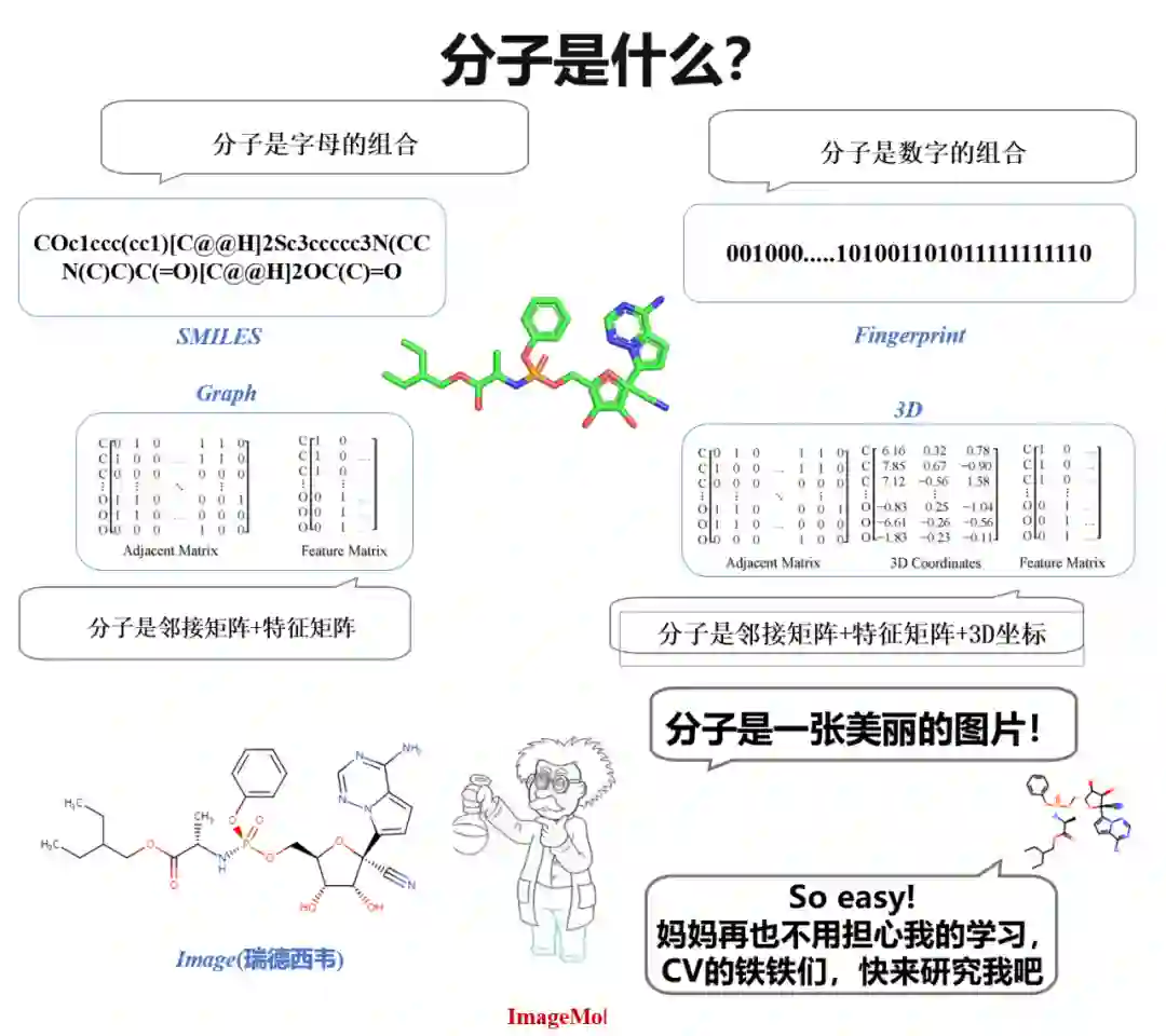 有趣的是,在高中化学学习分子的时候,我们看到的是分子的图像,化学家在设计分子时,也是对照分子图像进行观察和思考。一个自然的想法油然而生:“为什么不直接用分子图像来表征分子呢?”如果可以直接用图像来表征分子,那 CV(计算机视觉)里面的十八般武艺,不都可以用来研究分子吗?