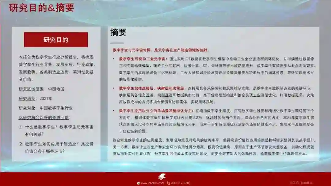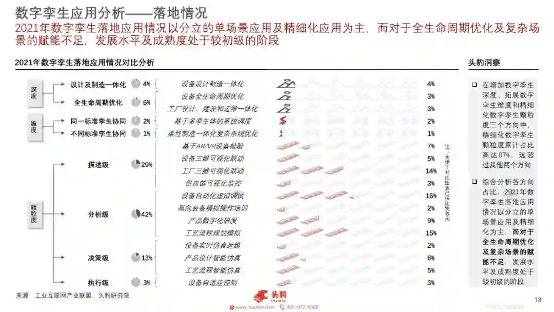 数字孪生应用以分立的单场景及精细化为主:在增加数字孪生深度、拓展数字孪生维度和精细化数字孪生颗粒度三个方向中,精细化数字孪生颗粒度累计占比高达87%,远超过其他两个方向。综合分析各方向占比,2021年数字孪生落地应用情况以分立的单场景应用及精细化为主,而对于全生命周期优化及复杂场景的赋能不足,发展水平及成熟度处于较初级的阶段。