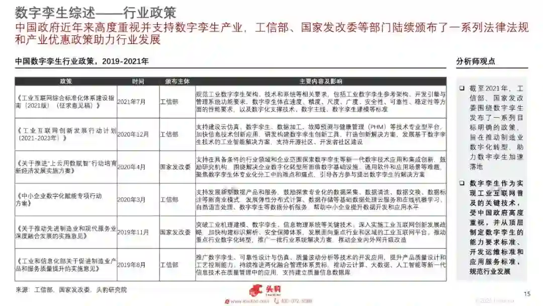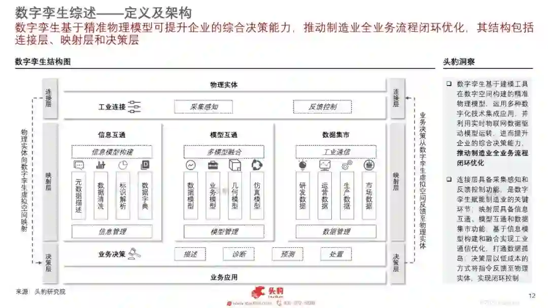 数字孪生包括连接层、映射层和决策层:连接层具备采集感知和反馈控制功能,是数字孪生赋能制造业的关键环节;映射层具备信息互通、模型互通和数据集市功能,基于信息模型构建和融合实现工业通信优化,打通数据孤岛;决策层以低成本的方式将指令反馈至物理实体,实现闭环控制。