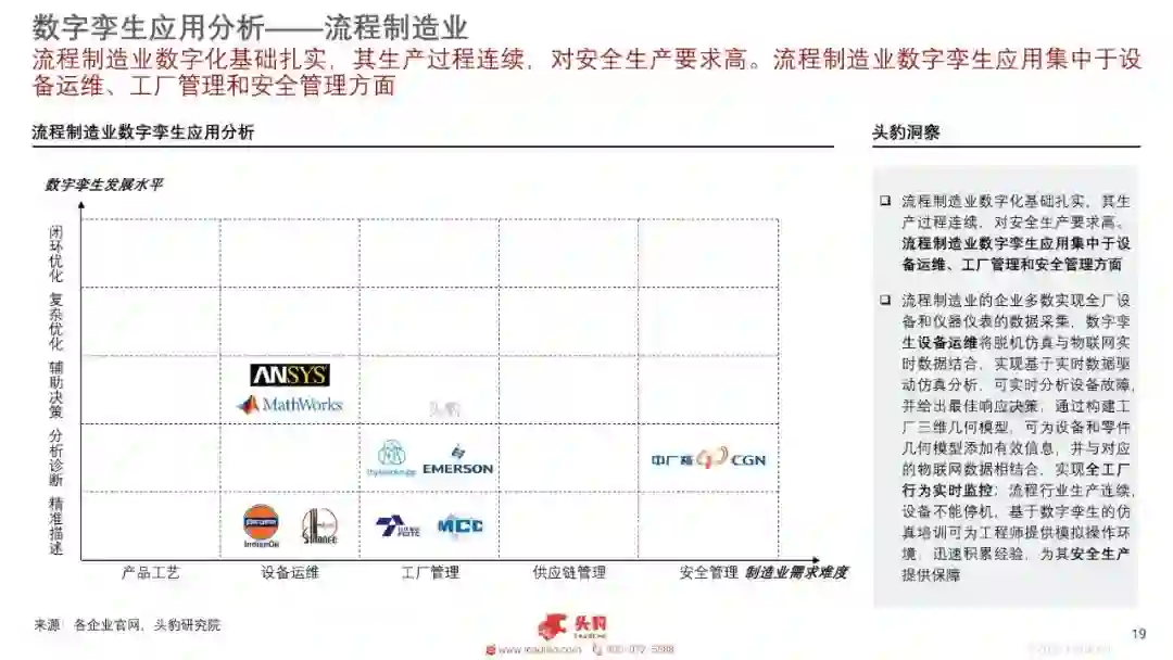 综合考量数字孪生的应用维度、发展成熟度及对场景的赋能水平,最具投资价值的应用场景是物料需求预测及良品率提升。另一方面,数字孪生在生产和安全环节实用性得分最高,投资价值最高,原因在于生产环节涉及大量设备,自动化程度较高从而对实时性要求高,数字孪生可低成本实现实时系统,而安全环节对人的依赖性强,亟需数字孪生仿真降低成本。