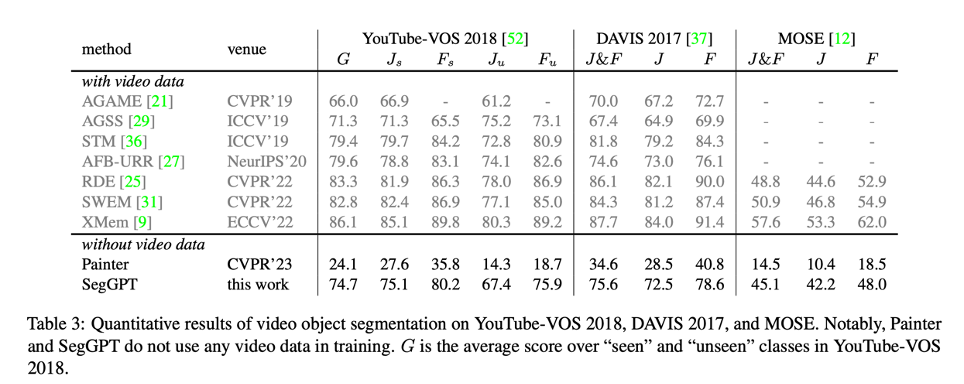 无需视频训练数据,SegGPT 可直接进行视频物体分割,并取得和针对视频物体分割专门优化的模型相当的性能。