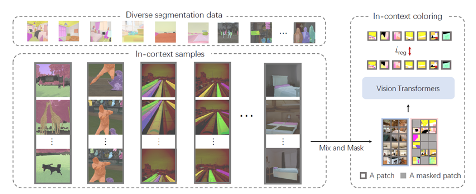 SegGPT 将不同的分割任务统一到一个通用的上下文学习框架中,通过将各类分割数据转换为相同格式的图像来统一各式各样的数据形式。