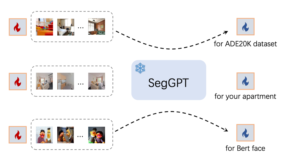 SegGPT 是智源通用视觉模型 Painter(CVPR 2023)的衍生模型,针对分割一切物体的目标做出优化。SegGPT 训练完成后无需微调,只需提供示例即可自动推理并完成对应分割任务,包括图像和视频中的实例、类别、零部件、轮廓、文本、人脸等等。