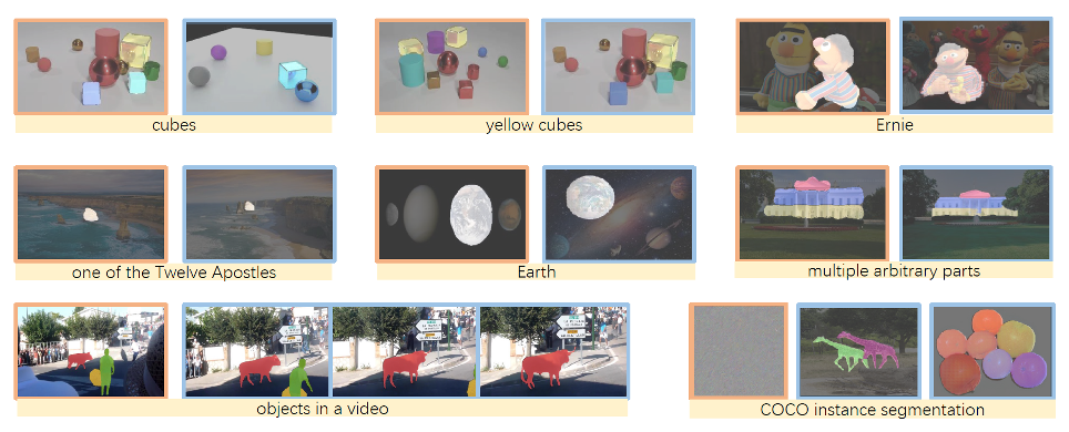 1. 通用能力:SegGPT 具有上下文推理能力,模型能够根据提供的分割示例(prompt),对预测进行自适应的调整,实现对 “everything” 的分割,包括实例、类别、零部件、轮廓、文本、人脸、医学图像、遥感图像等。