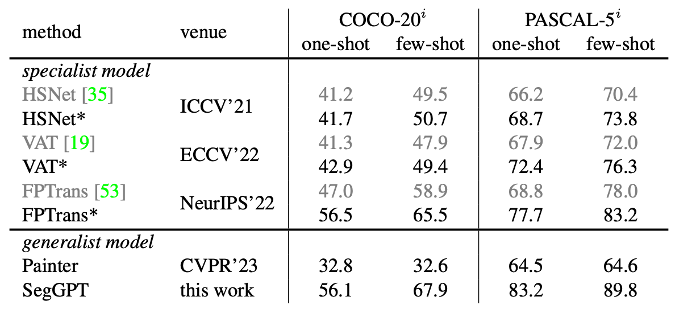 模型只需少数 prompt 示例,在 COCO 和 PASCAL 数据集上取得最优性能。SegGPT 显示出强大的零样本场景迁移能力,比如在少样本语义分割测试集 FSS-1000 上,在无需训练的情况下取得 state-of-the-art 性能。