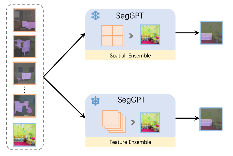如何通过 test-time techniques 解锁各种能力是通用模型的一大亮点。SegGPT 论文中提出了多个技术来解锁和增强各类分割能力,比如下图所示的不同的 context ensemble 方法。所提出的 Feature Ensemble 方法可以支持任意数量的 prompt 示例,实现丰俭由人的推理效果。