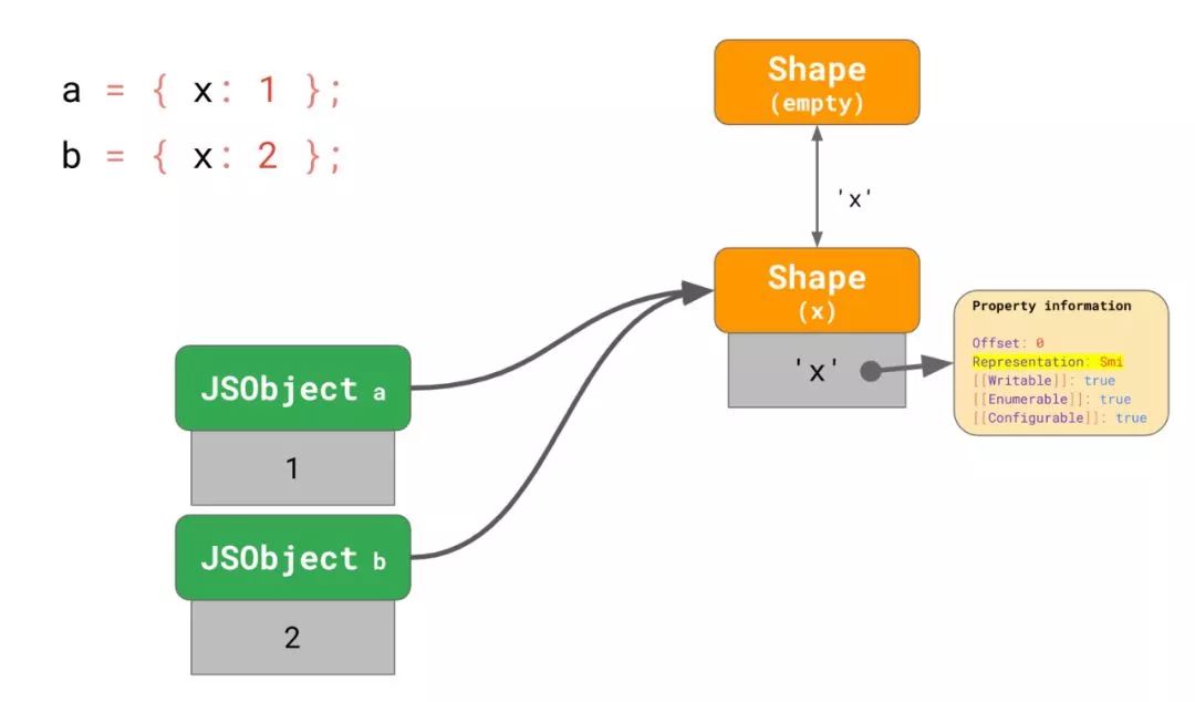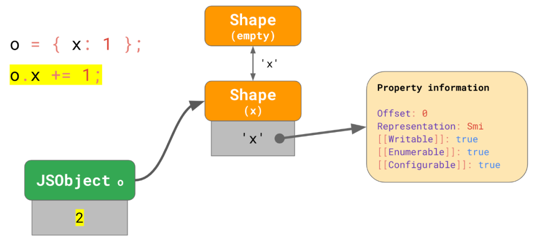 那么一开始这两个对象都指向同一个 shape,其中x被标记为Smi表达。