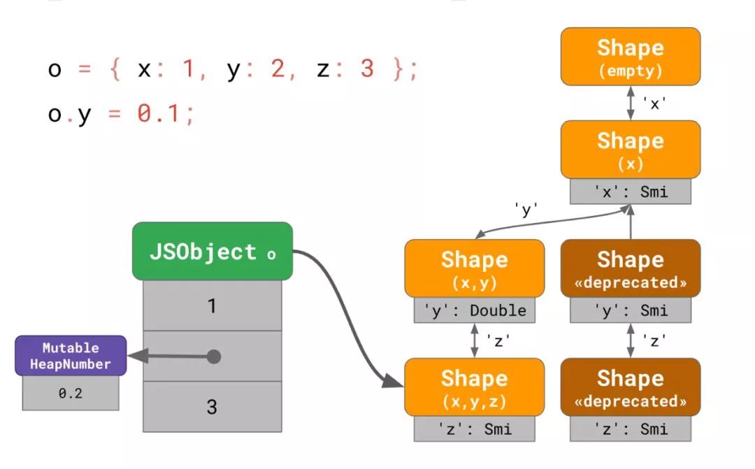 从分离 shape 开始,我们为 y 创建了一个可以重放所有之前的转变的新转变链 (transition chain),但是其中'y'被标记成 Double 表达。然后我们使用这个新的转变链并将旧的子树标记为废弃的。在最后一步我们把实例o迁移到了新的 shape,并使用了MutableHeapNumber来保存 y 的值。这样,新的对象就不会使用老的路径,而且一旦旧 shape 的引用小时,树中废弃的 shape 的那部分就会消失。