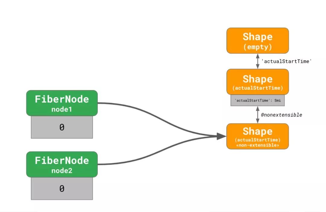 V8 指派了一个新的孤立 shape 给node1,然后稍后node2也发生了同样的情况,导致了两个孤岛,每个孤岛都有着自己不相交的 shape。很多真实的 React 应用不止有 2 个,而是有超过成千上万个FiberNodes。如你所想,这种情况对 V8 的性能来说不是什么好事。