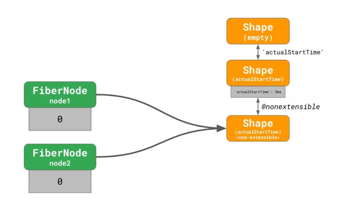 这两个FiberNode实例指向了不可扩展且actualStartTime为Smi表达的 shape。当第一个对node1.actualStartTime的赋值发生时,一个新的转变链被创建并且之前的转变链被标记为废弃的: