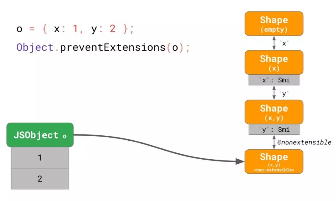 如我们之前所知,一切从空 shape 转变到一个包含属性'x'(以Smi形式表达) 的新 shape 开始。当我们阻止了对b的扩展,我们对新的 shape 进行了一个特殊的转变 -- 将其标记为不可扩展。这个特殊的转变没有引入任何新的属性 -- 它实际上只是个标记。