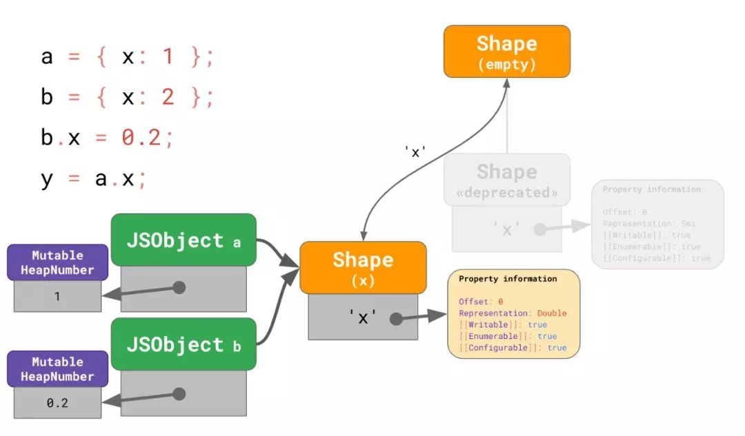 当b.x修改为 Double 表达时,V8 分配了一个新的 shape 而且其中的x被指定为 Double 表达,并指向空 shape。V8 也会为属性 x 分配一个MutableHeapNumber来保存这个新的值0.2。然后当再更新对象b指向这个新的 shape,并更改对象中的槽以指向偏移 0 处的先前分配的MutableHeapNumber。最后,我们将旧的 shape 标记为废弃的并且将其从转变树 (transition tree) 中摘除。这是通过'x'从空 shape 到新创建的 shape 的转变 (transition) 来完成的。