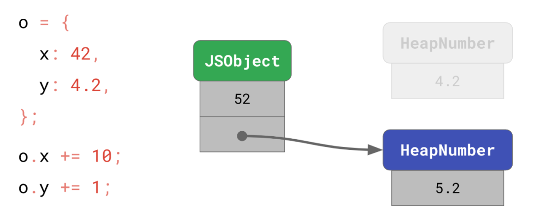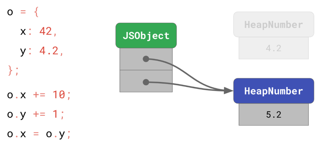 另一方面,y=5.2的新值不属于Smi,而且和之前的4.2也不同,所以 V8 分配了一个新的HeapNumber实体并将地址赋值给y。