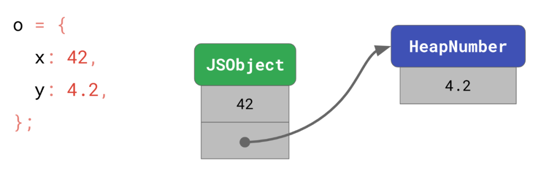 x 的值 42 可以被编码为 Smi,所以它可以被存储在对象自身中。而y的4.2需要一个分开的实体来保存这个值,然后这个对象指向那个实体。