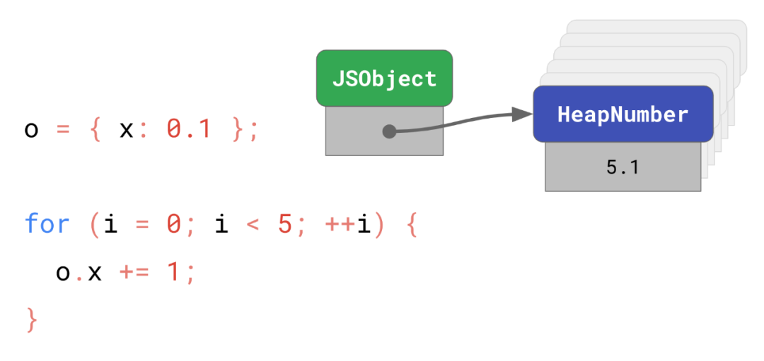 第一行代码将会创建一个HeapNumber实例并初始化其值为0.1。循环体将其改为1.1,2.1,3.1,4.1直到5.1,总共创建了 6 个HeapNumber实例,其中 5 将会在循环结束后成为内存垃圾。